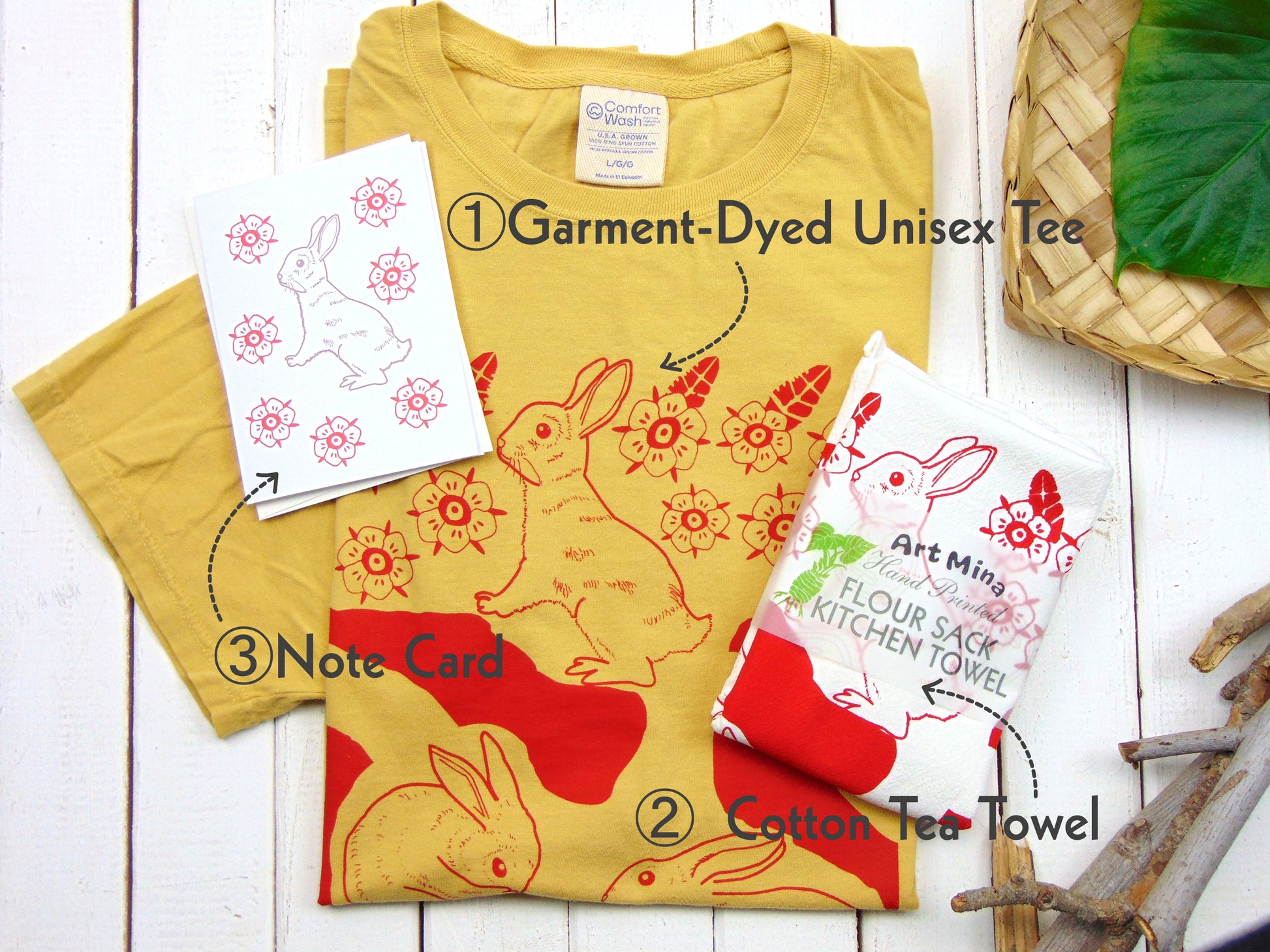 The perfect gift for Easter, Mother’s Day, or any bunny lover: our Screen Print Bunny Gift Set! This charming set includes a garment-dyed unisex t-shirt made from 100% American-grown cotton and a bunny flour sack tea towel, both hand-screen printed with eco-friendly inks for a soft, durable finish. Plus, enjoy a free note card for personal messages or gift-giving.