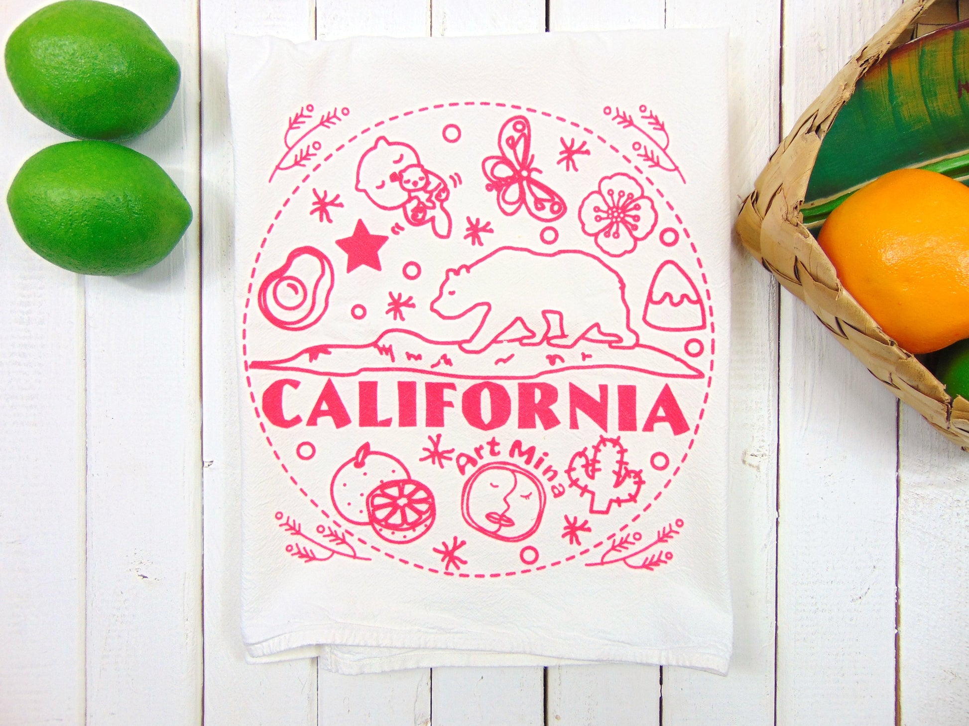 Flour Sack "California Bear" Kitchen Tea Towel. This eco-friendly cute dish towel was illustrated and hand-printed by Mina Wilcox with joy from her small art studio in California.