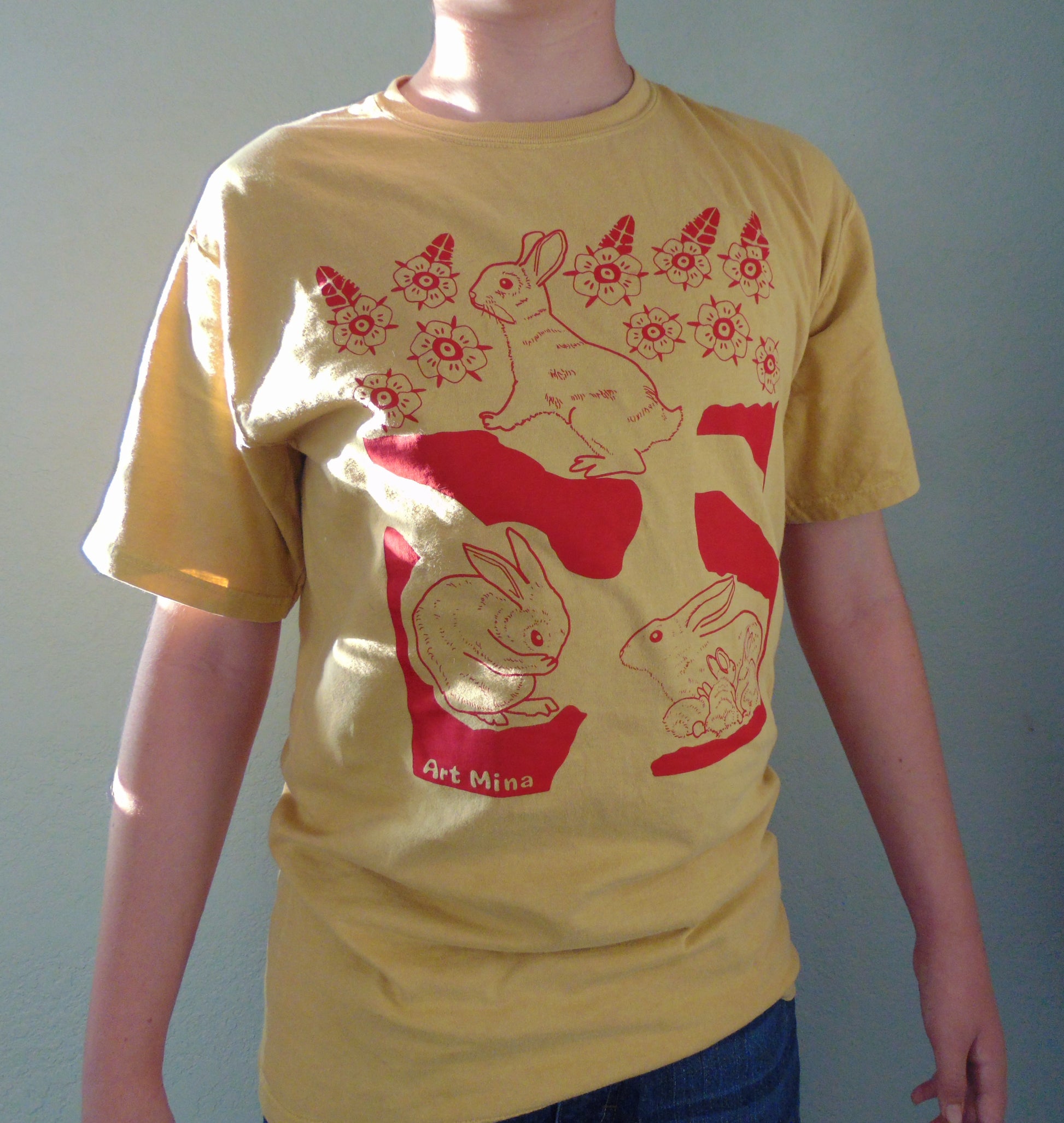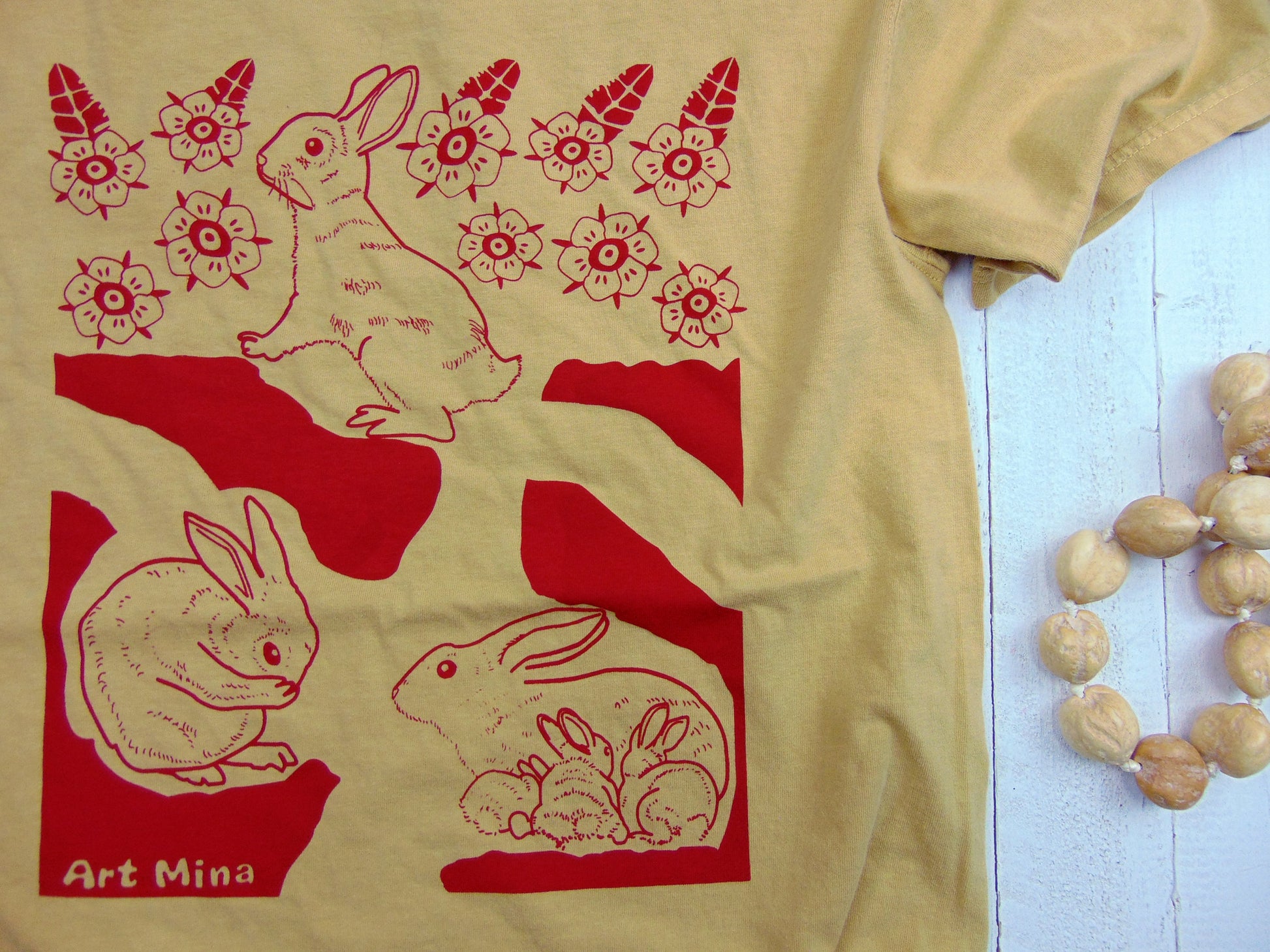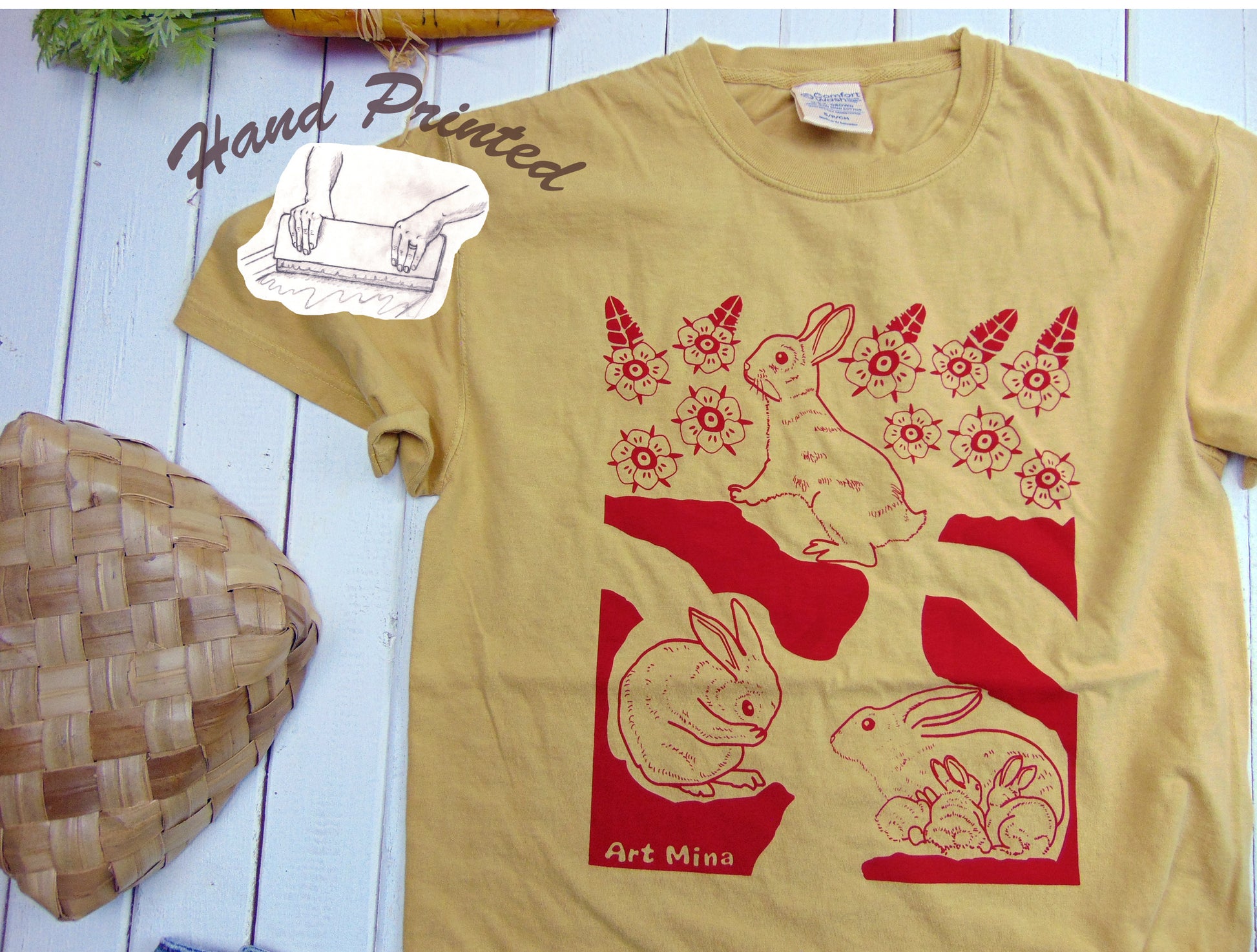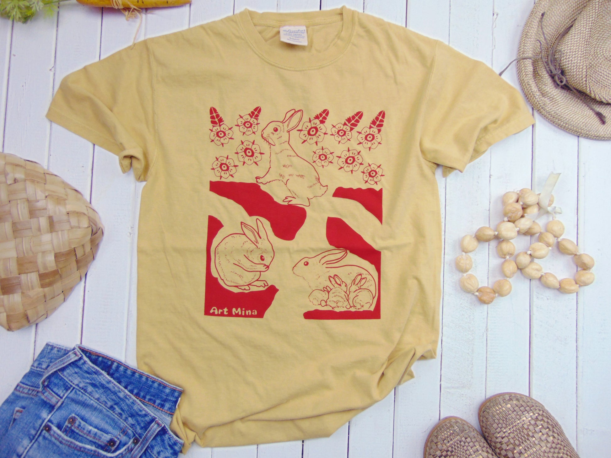 Thanks for taking a look at our Art Mina shop! Please feel free to contact us if you have a question. If you want to order more than what is currently displayed in our inventory or if you would like T-shirts in different colors, please send us a message. We will check our stock or arrange for a custom print, just for you! We love that this Rabbit tee becomes a part of your happy life!